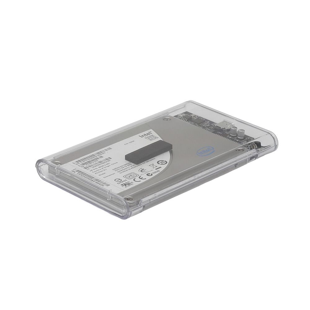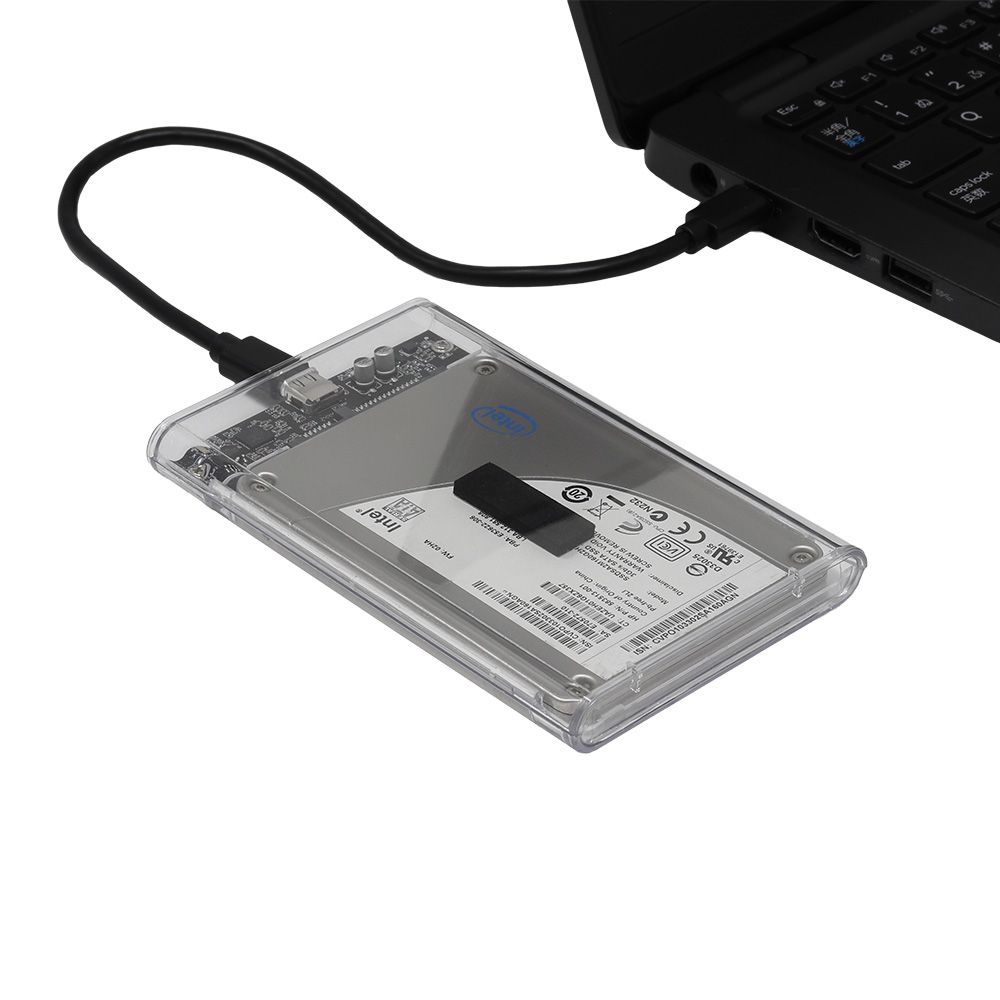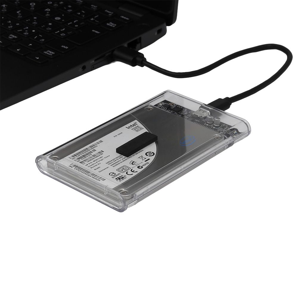 - 透明なプラスチックケースで、内部のSSD/HDDを確認できます。