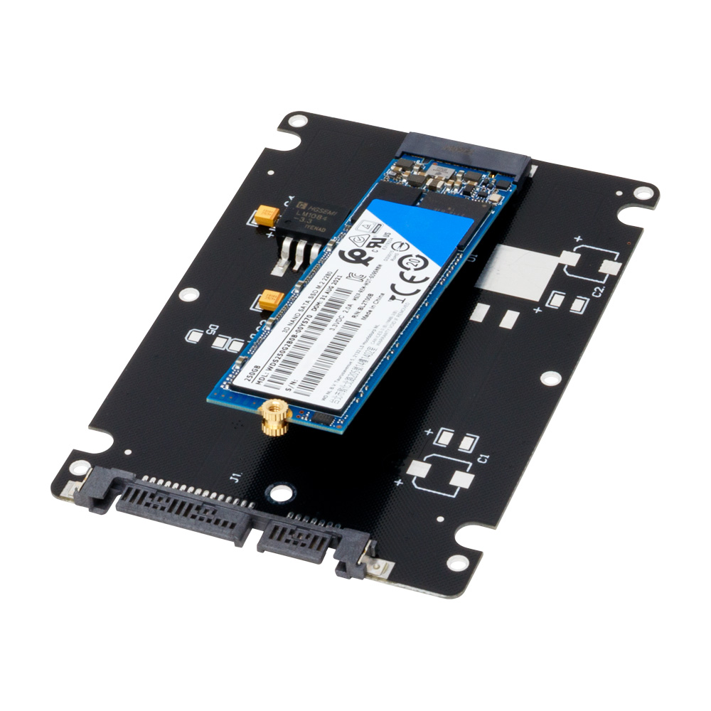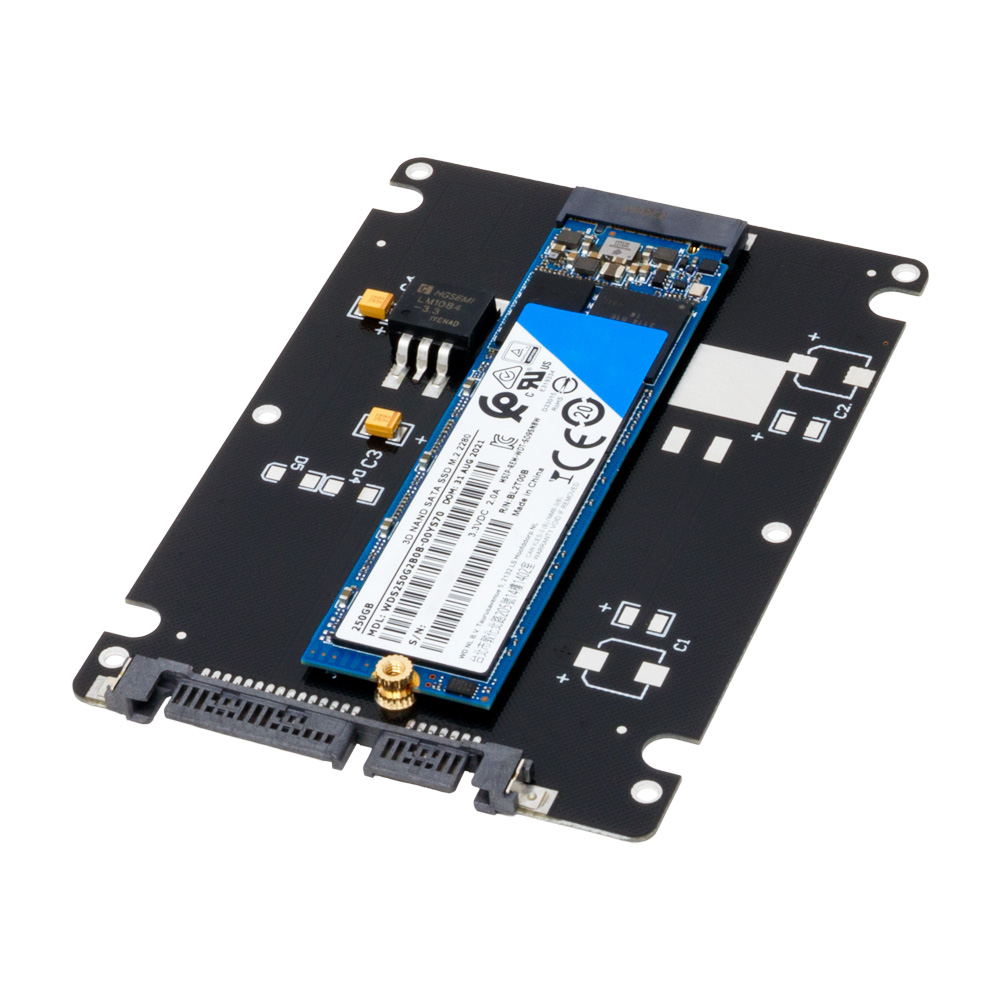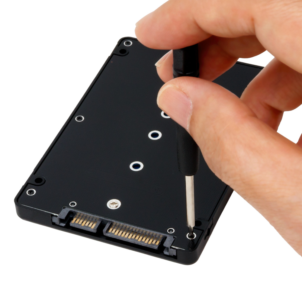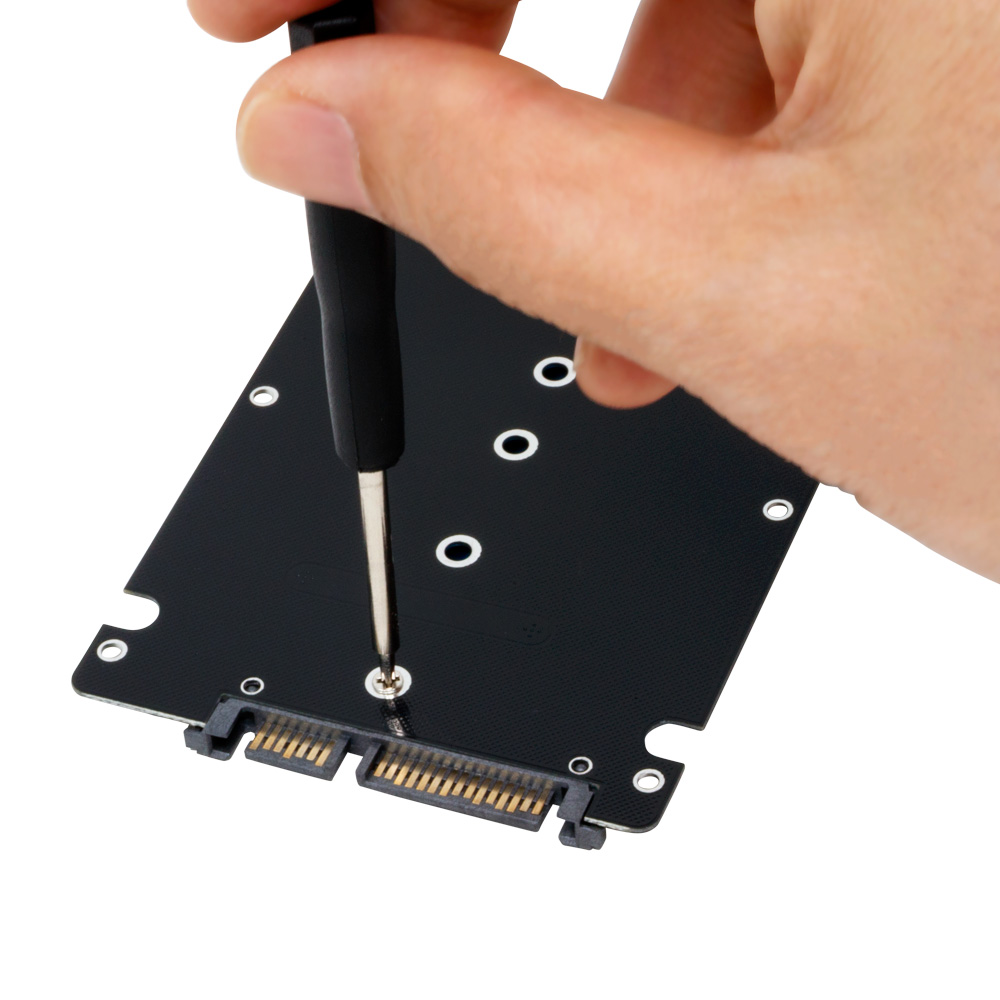M.2 SATA SSD Type 2280専用です。1. プラスチックカバーを取り外します。M.2 SATA SSDをM.2カードスロットに斜め上から挿入します。SSDとスロットの切り欠きを合わせます。2. M.2 SATA SSDにある半円形の切り欠きとM.2 SSD固定用スタンドオフの窪みを合わせます。3. スタンドオフをつけたままM.2 SATA SSDを押し下げます。4. 基板裏からネジでスタンドオフを固定します。5.6.7. プラスチックカバーを取り付けます。基板とカバーをタッピングネジで固定します。基板の角と長辺の中間にある、銀色のふち取りがされた固定穴です。8. 6カ所すべてネジ留めします。7mm厚の2.5インチSSDと同一のサイズ/ネジ穴位置7mm厚の2.5インチSSDと同一のサイズ/ネジ穴位置(旧仕様版)7mm厚の2.5インチSSDと同一のサイズ/SATAコネクタ位置