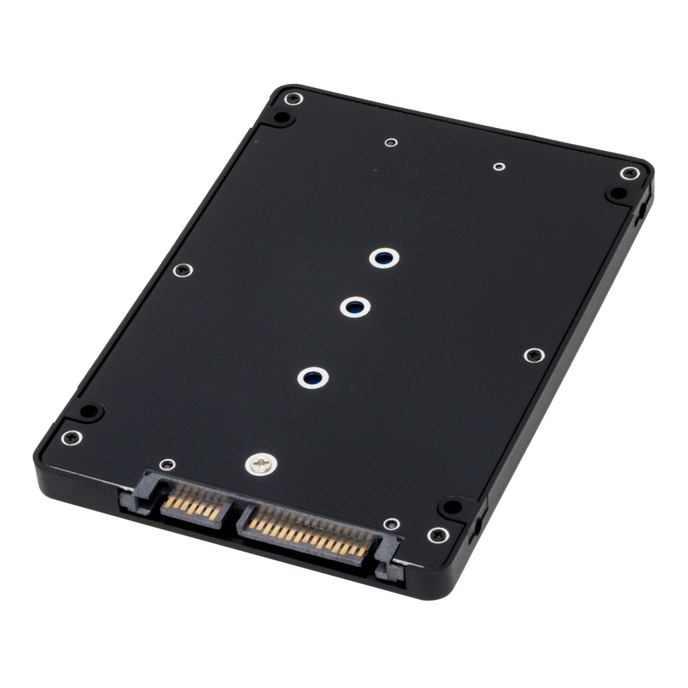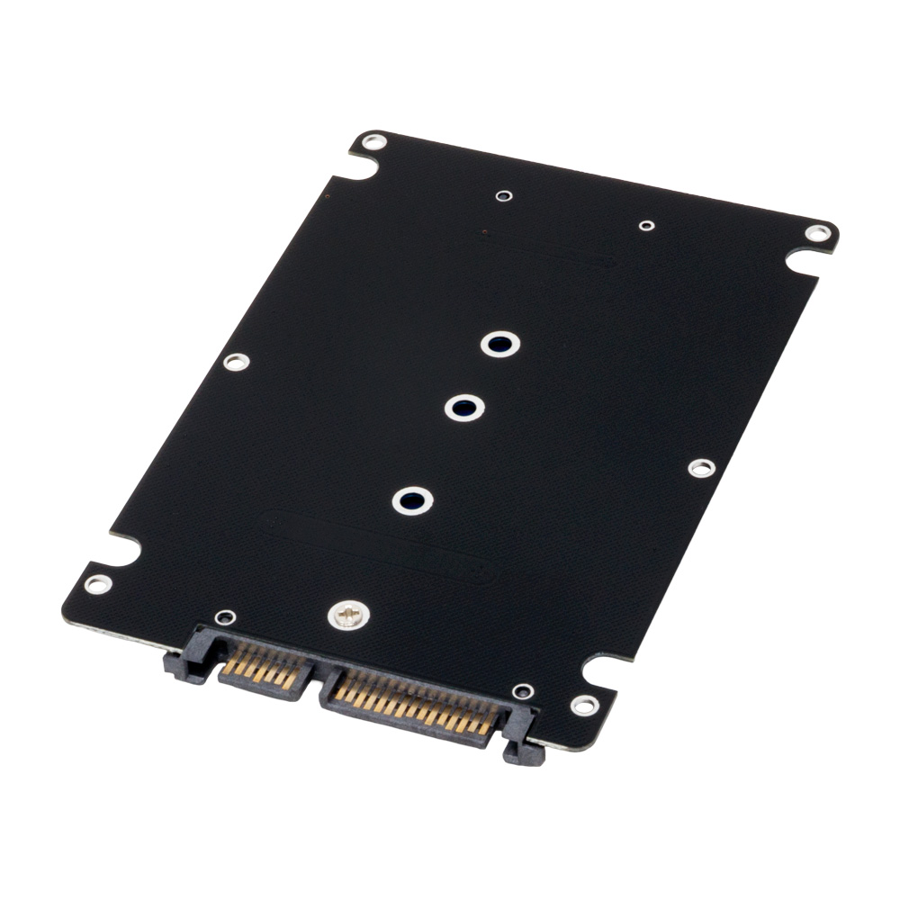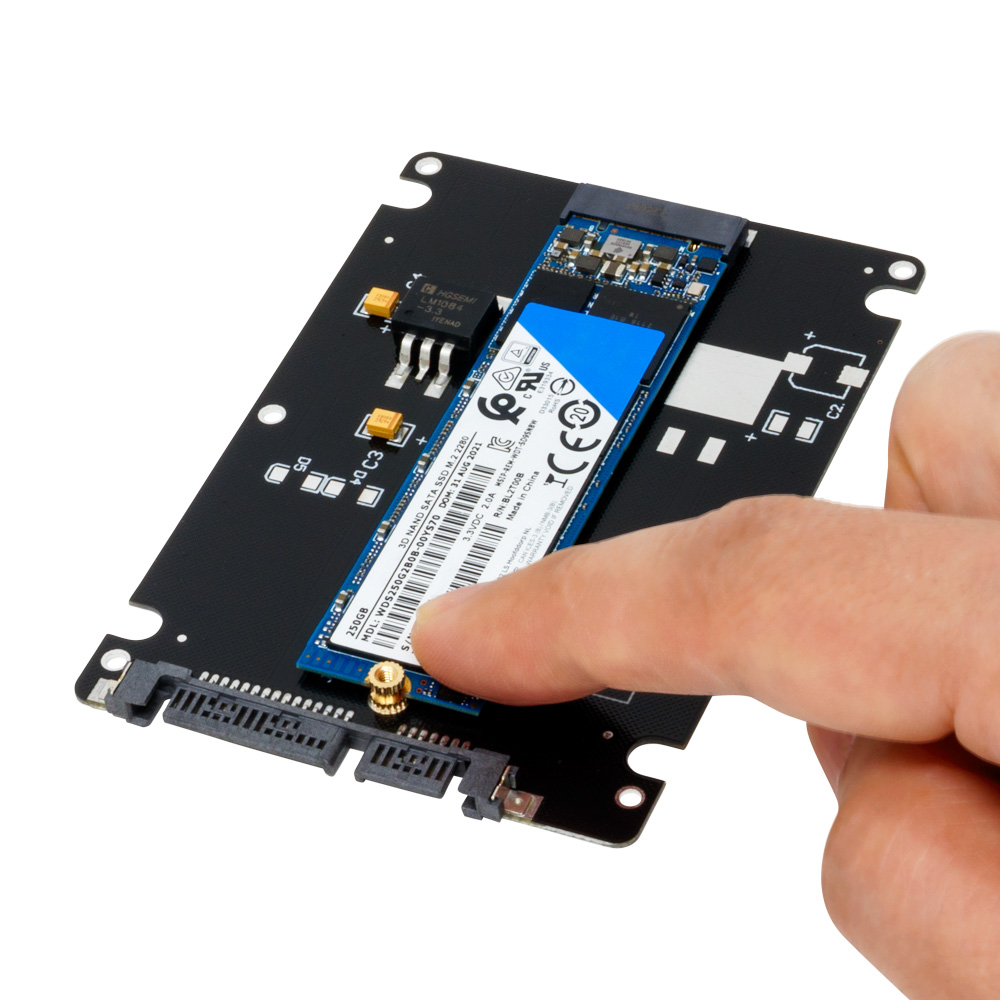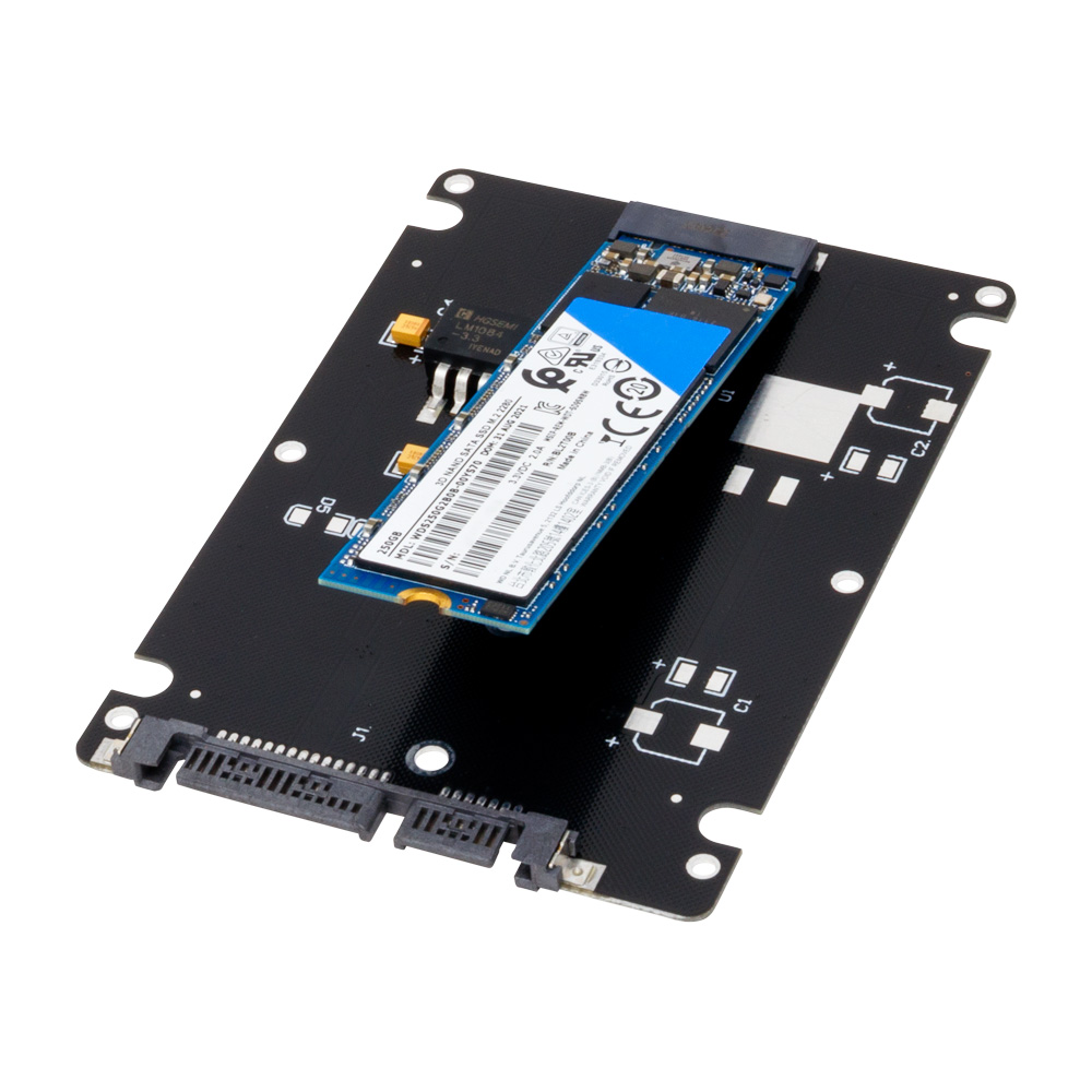 M.2 SATA SSD Type 2280専用です。1. プラスチックカバーを取り外します。M.2 SATA SSDをM.2カードスロットに斜め上から挿入します。SSDとスロットの切り欠きを合わせます。2. M.2 SATA SSDにある半円形の切り欠きとM.2 SSD固定用スタンドオフの窪みを合わせます。3. スタンドオフをつけたままM.2 SATA SSDを押し下げます。4. 基板裏からネジでスタンドオフを固定します。5.6.7. プラスチックカバーを取り付けます。基板とカバーをタッピングネジで固定します。基板の角と長辺の中間にある、銀色のふち取りがされた固定穴です。8. 6カ所すべてネジ留めします。7mm厚の2.5インチSSDと同一のサイズ/ネジ穴位置7mm厚の2.5インチSSDと同一のサイズ/ネジ穴位置(旧仕様版)7mm厚の2.5インチSSDと同一のサイズ/SATAコネクタ位置
