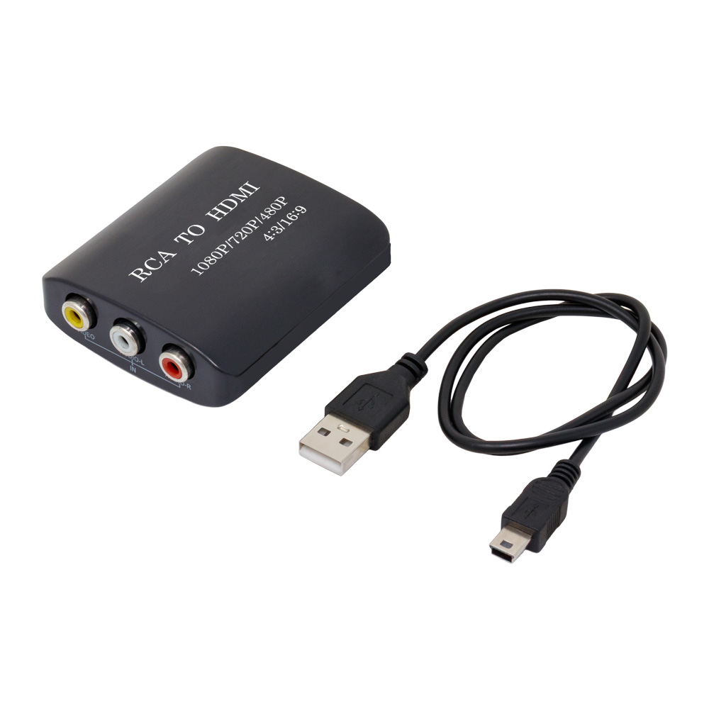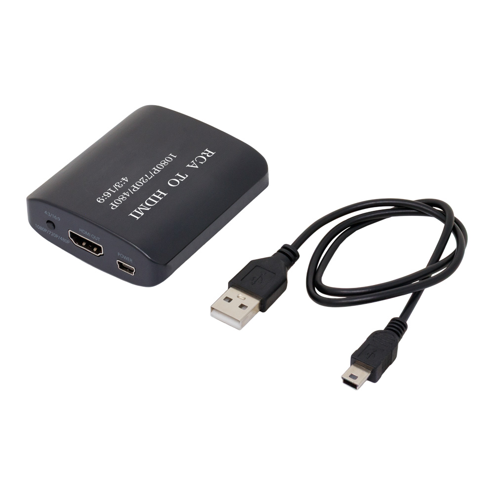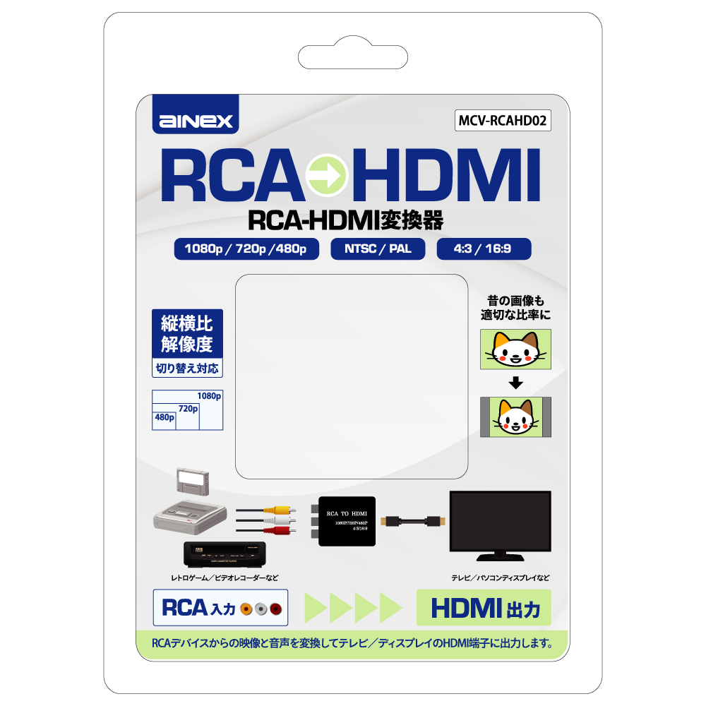 RCAデバイスからHDMIポート搭載テレビ/ディスプレイなどに映像と音声を出力します。縦横比と解像度の切り替えに対応。